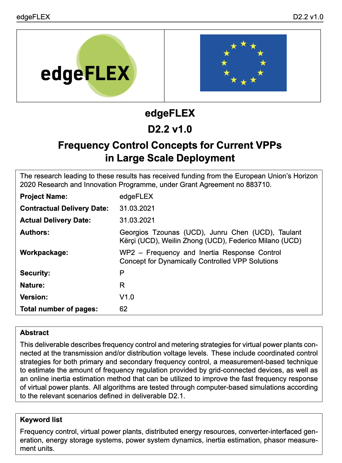Response Control for VPPs, H2020 Project edgeFLEX, ID 883710,